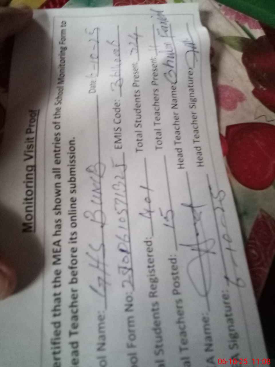 | Attendance Register | Head Teacher | MEA with School | Visit Proof |