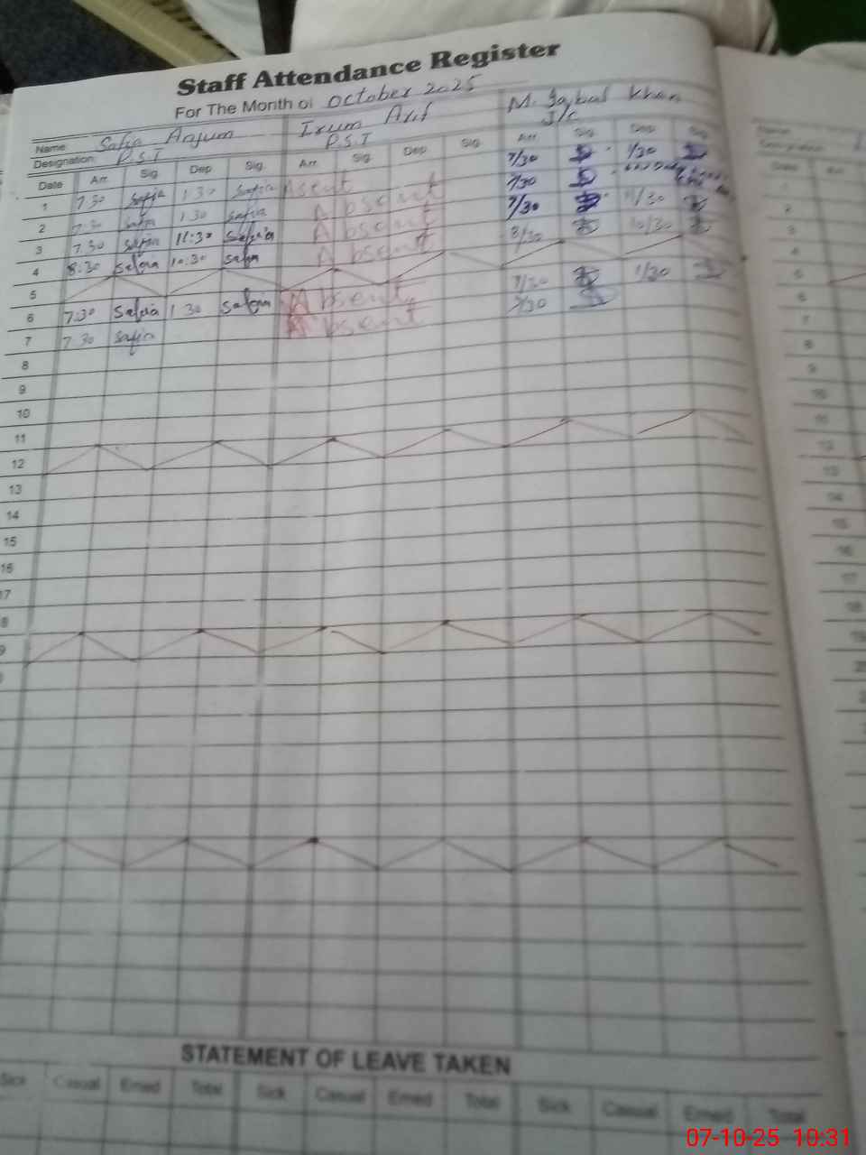 | 36**** | Ir**** Ar**** | 1 | 1 | 0 | 0 | 0 | 0 | 0 | 0 | 0 | 0 | 0 | Absent (Un-Authorized) |