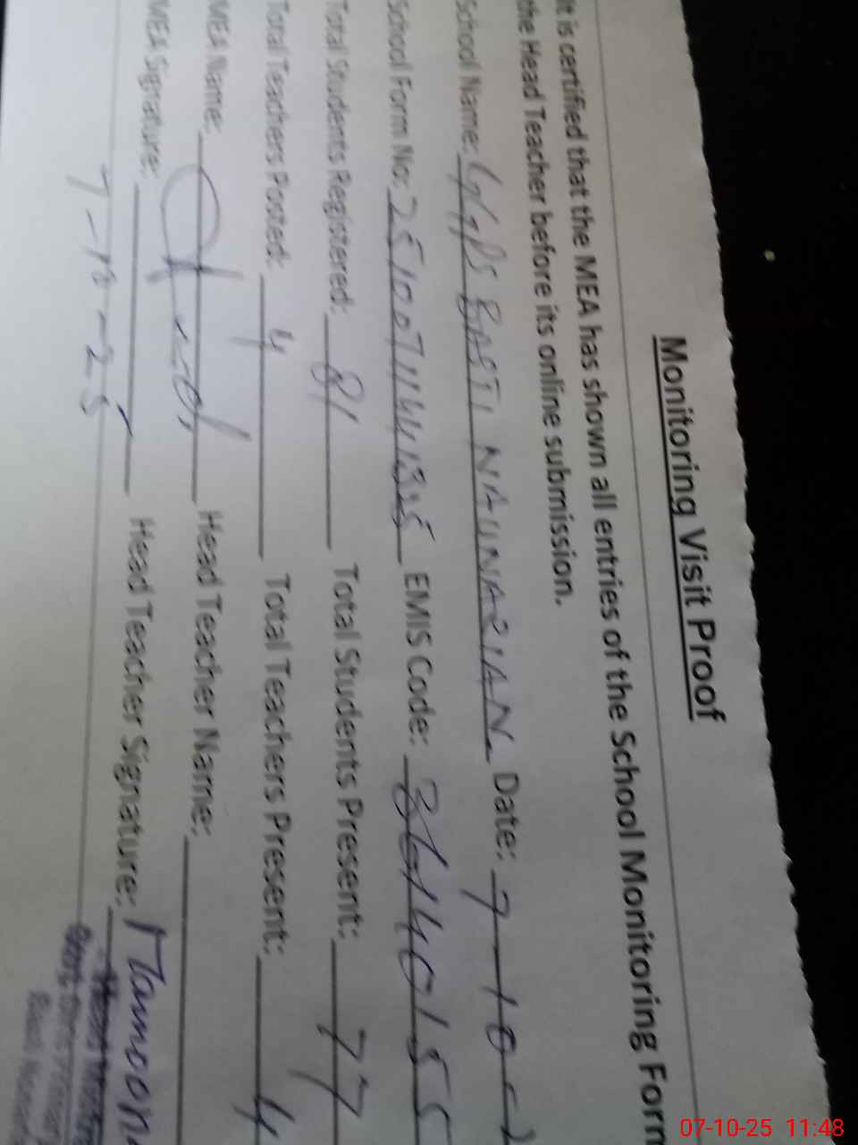 | Attendance Register | Head Teacher | MEA with School | Visit Proof |