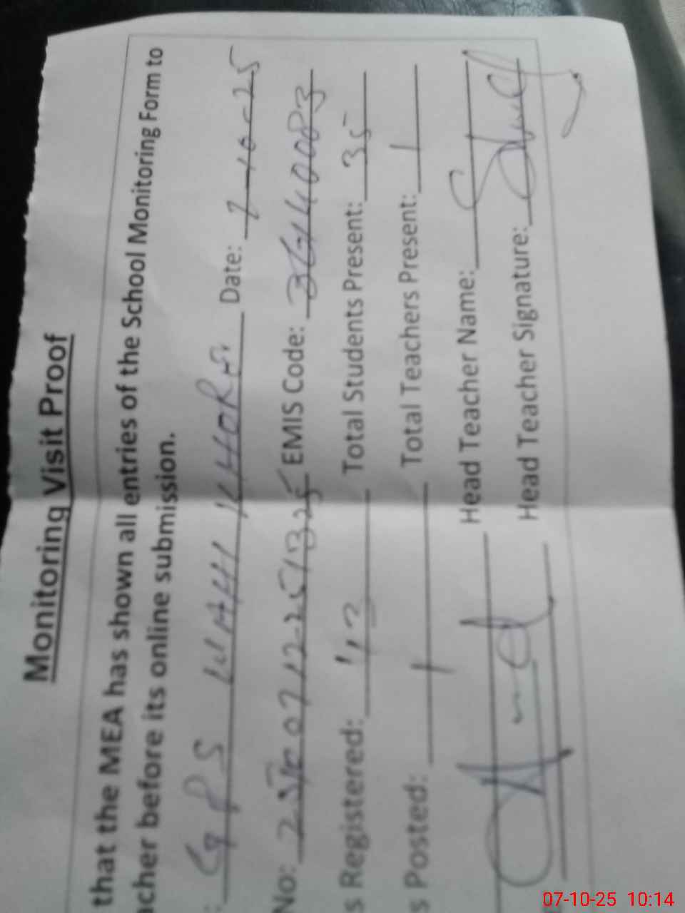 | Attendance Register | Head Teacher | MEA with School | Visit Proof |