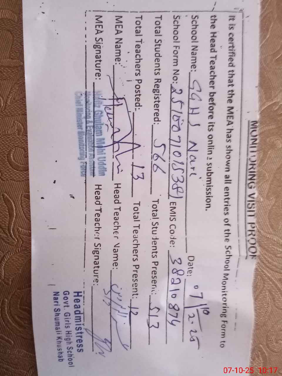 | EMIS Code: 38210874 | Name of School: GGHS NARRI SHUMALI KHUSHAB | |||