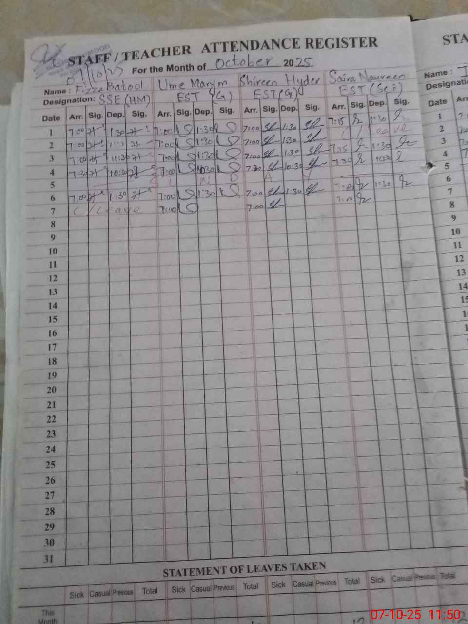 | Remarks (Use Separate Page if Required): Head Teacher Fizza batool was oc C leave but AEO did not approve the leave I mark her unauthorised absent Submitted pls | |||||