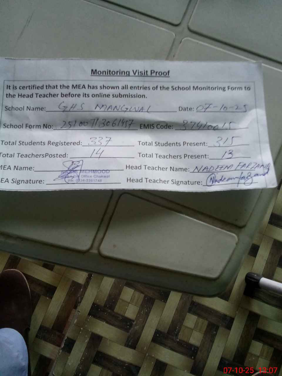 | Attendance Register | Head Teacher | MEA with School | Visit Proof |