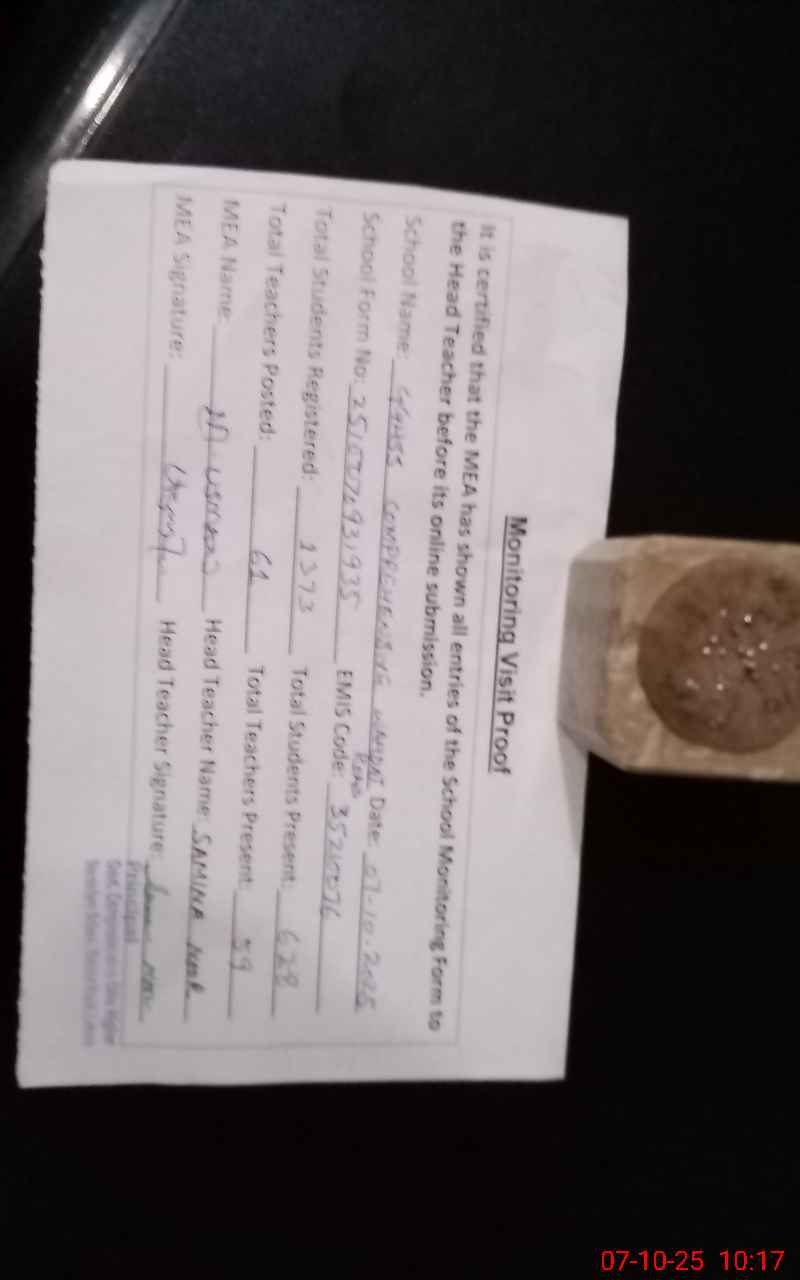 | Remarks (Use Separate Page if Required): 15 class rooms are dangerous since 2012 01 Wash room is nonfunctional due to locked Being a maximum staff of teachers in which 59 are present a private teacher of Bio named HIRA hired for 1st year students Grass cutting is not carried out Cleaning of wash rooms is poor Garbage is present in open air Repair work need in school A fake strength of 1209 students is given to me where as actual strength is 628 Teacher named Iqra Naz is absent from 26 August 2025 Soap was not available at maximum hand washing points | |||||