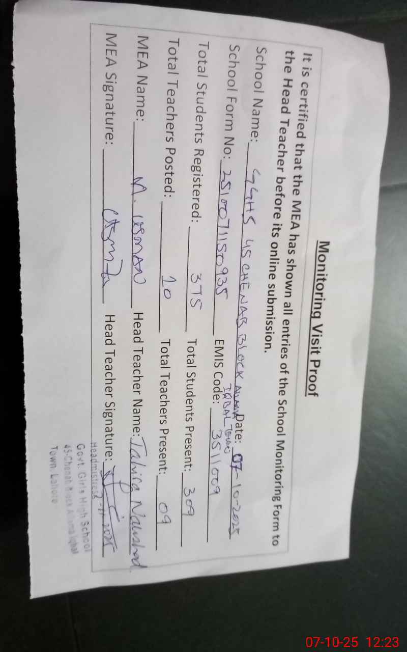 | EMIS Code: 35211009 | Name of School: GGHS 45- CHENAB BLOCK ALLAMA IQBAL TOWN | |||