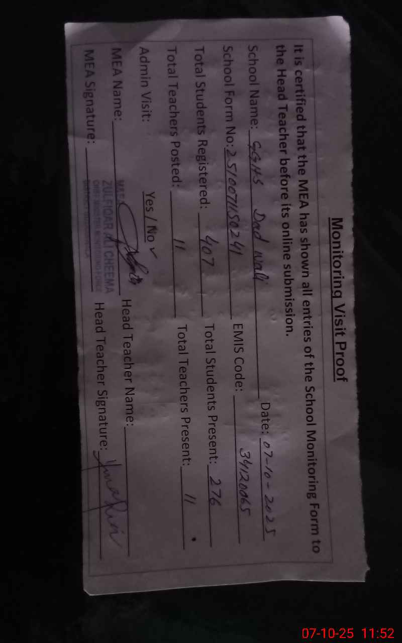 | EMIS Code: 34120065 | Name of School: GGHS DAD WALI | |||