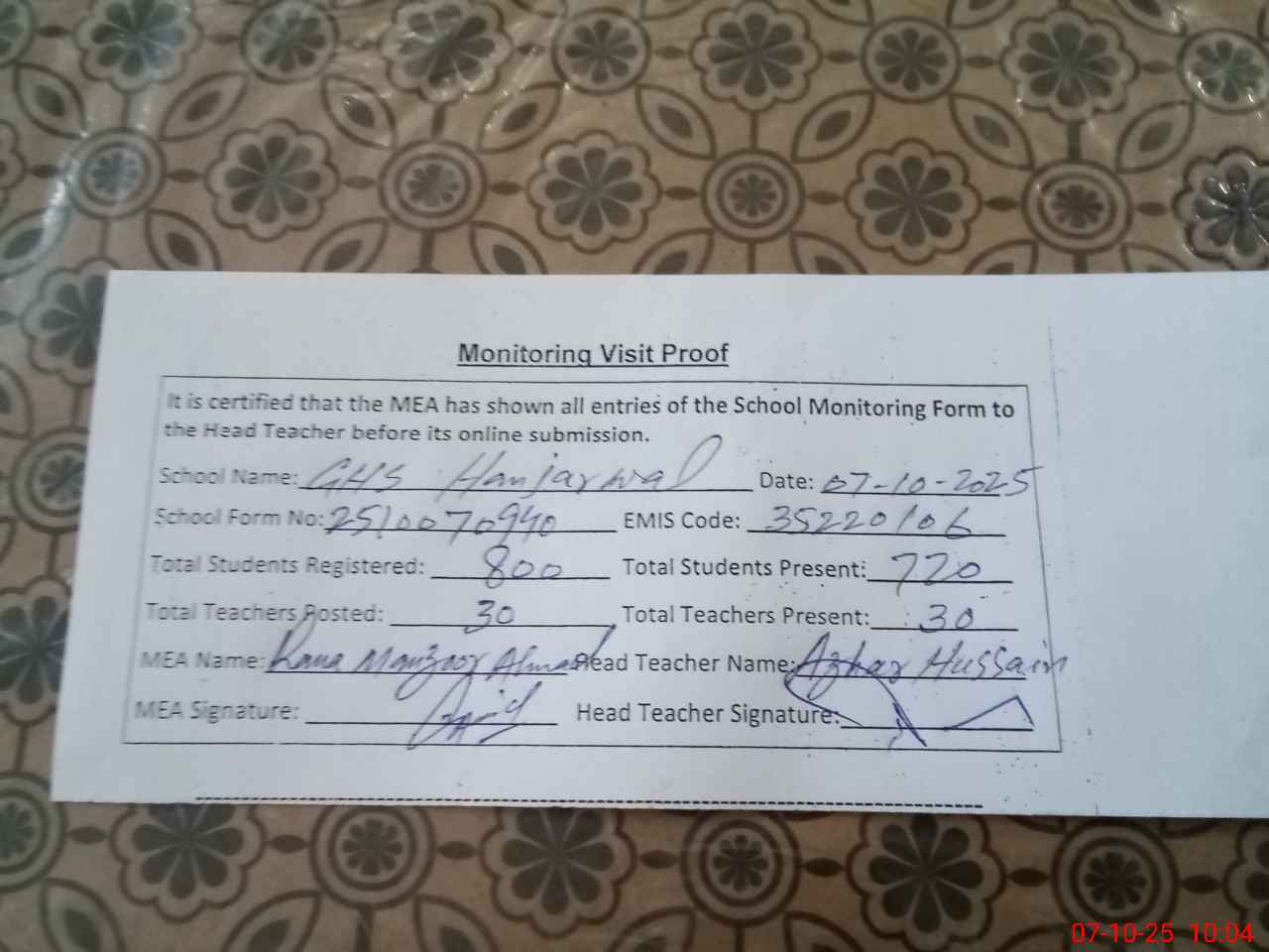| Certified that this School was Inspected by the Undersigned MEA/DMO Today and the Information Stated Above is as Per Record. | |||||