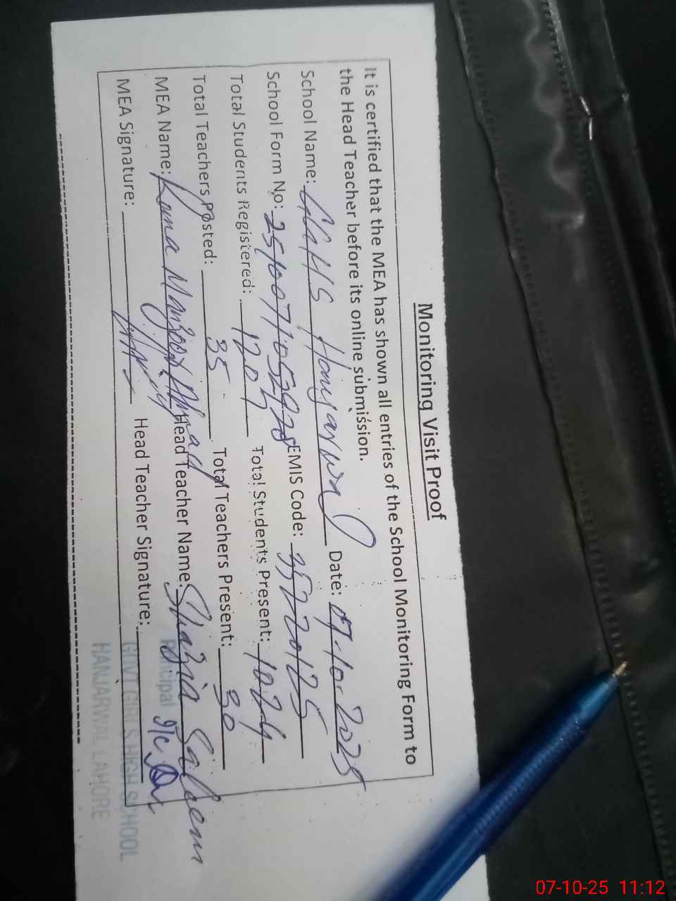 | Certified that this School was Inspected by the Undersigned MEA/DMO Today and the Information Stated Above is as Per Record. | |||||