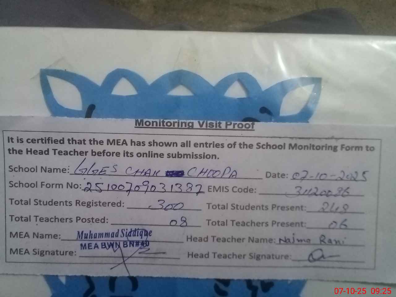 | Certified that this School was Inspected by the Undersigned MEA/DMO Today and the Information Stated Above is as Per Record. | |||||
