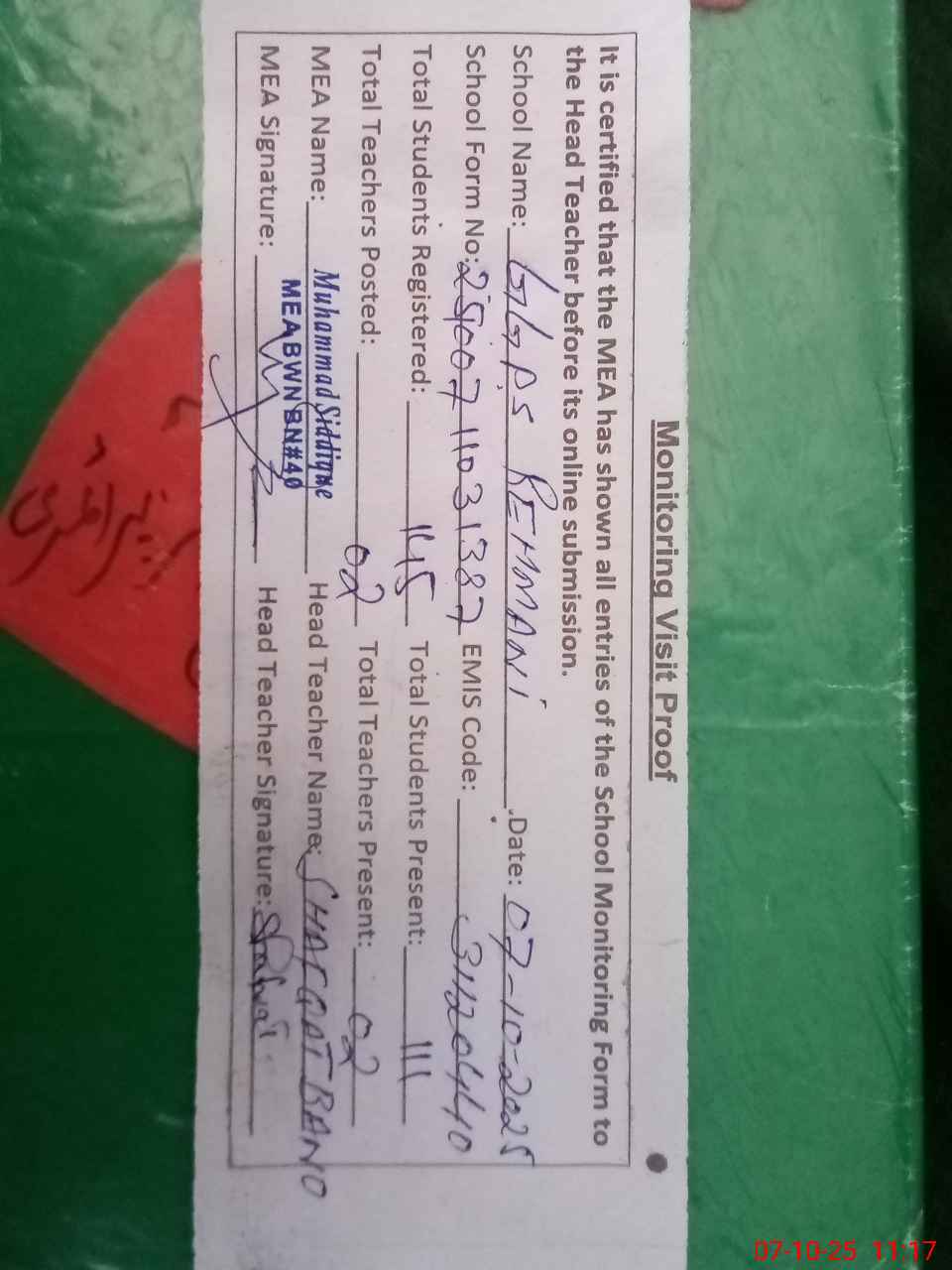 | EMIS Code: 31120440 | Name of School: GGPS REHMANI | |||