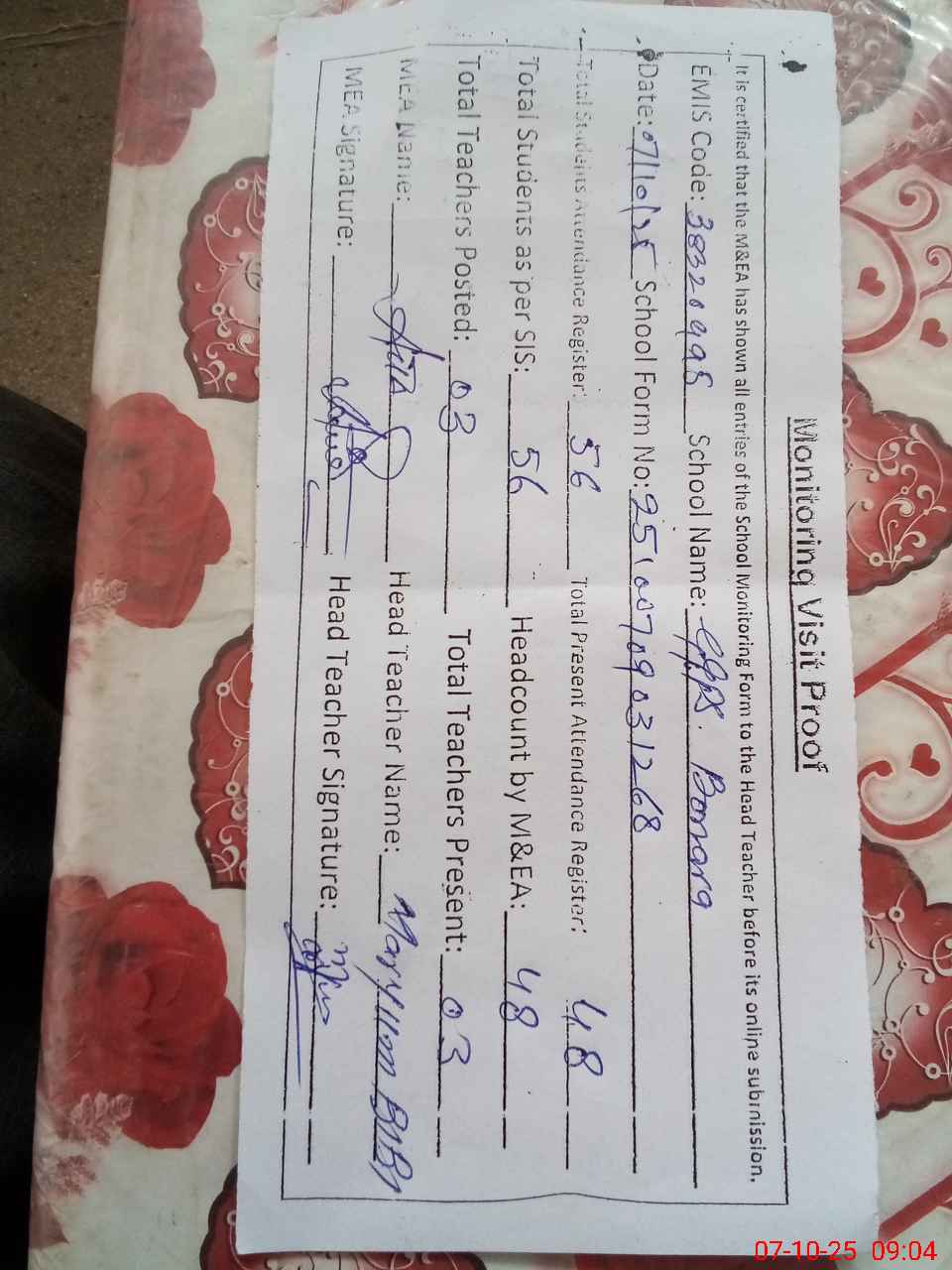 | Attendance Register | Head Teacher | MEA with School | Visit Proof |