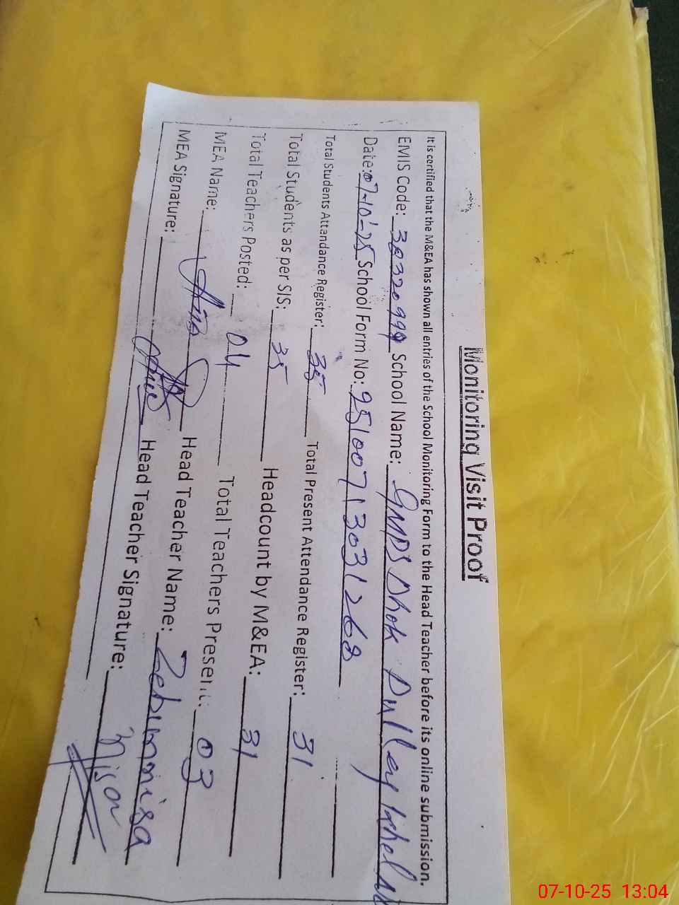 | Attendance Register | Head Teacher | MEA with School | Visit Proof |