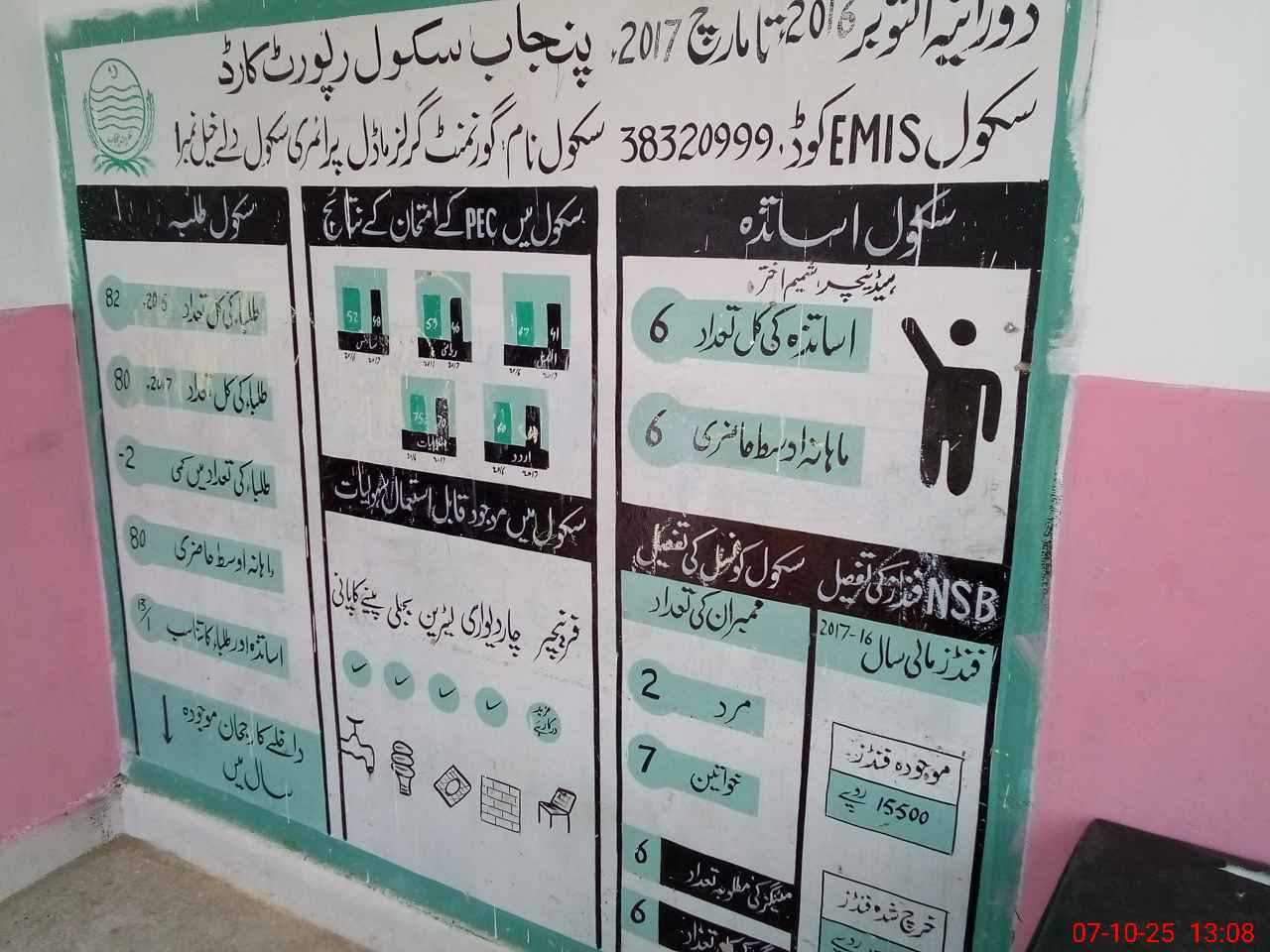 | Total no. of Classrooms: 5 No. of Classrooms Used for Teaching: 3 No. of Classrooms Storing Old Furniture, FTBs, etc: 0Comments if Any: 02 toilets blocked in 2nd portion therefore partially Boundary walls not functional in 2nd portion FTF and NSB and D3 record not available 02 classrooms walls cracked in 2nd portion and no rooms not used teaching |