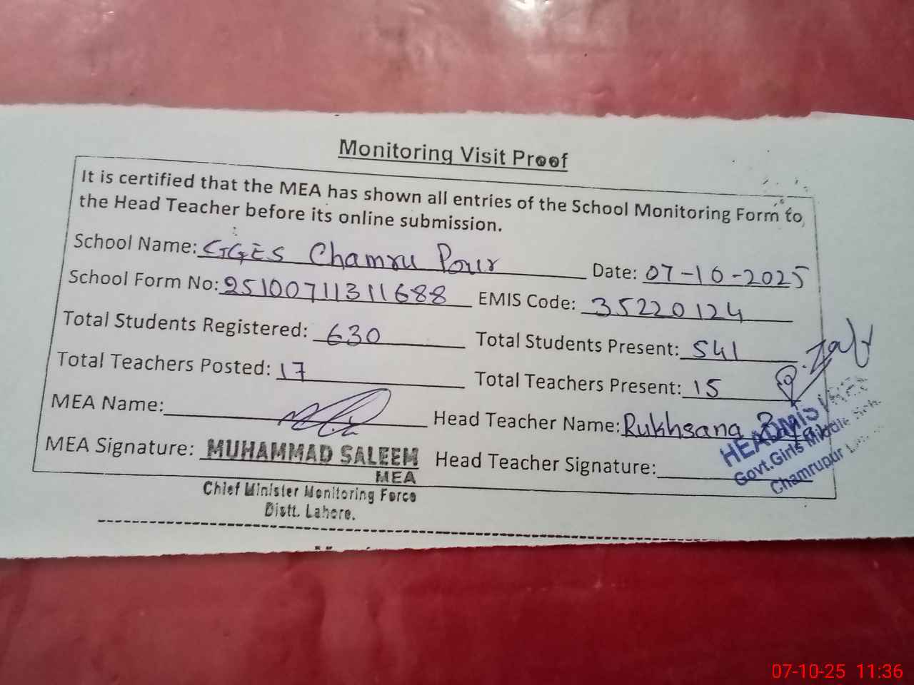 | Remarks (Use Separate Page if Required): PST teacher Amna Raza found absent after summer vacations not reported back to school PST teacher Shaheena Gazal is on metrinity leave wef 29 November 2025 by order no 13609408 Lhr 2025 dated 23rd September 2025 NQ Haider Saleem is attached with office of Chief executive Officer DEA Lahore his last order no no3147 A III Dated 24th June 2025 dates become overdated new order not found so marked him absent as per SOP One toilet is functional but unsatisfactory condition 35220124 | |||||
