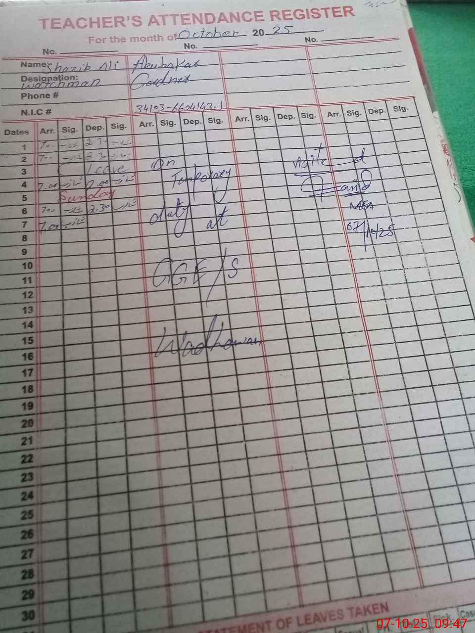 | CNIC | Full Name | Designation | R/C | Absence during last cal. month |