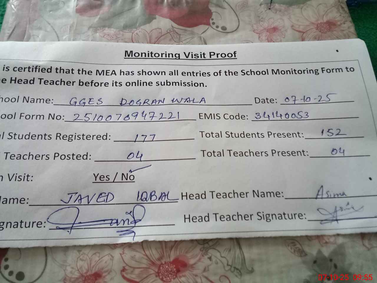 | Certified that this School was Inspected by the Undersigned MEA/DMO Today and the Information Stated Above is as Per Record. | |||||