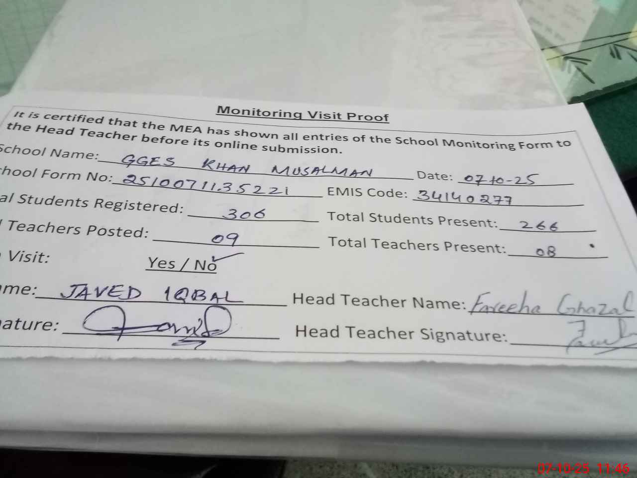 | Attendance Register | Head Teacher | MEA with School | Visit Proof |