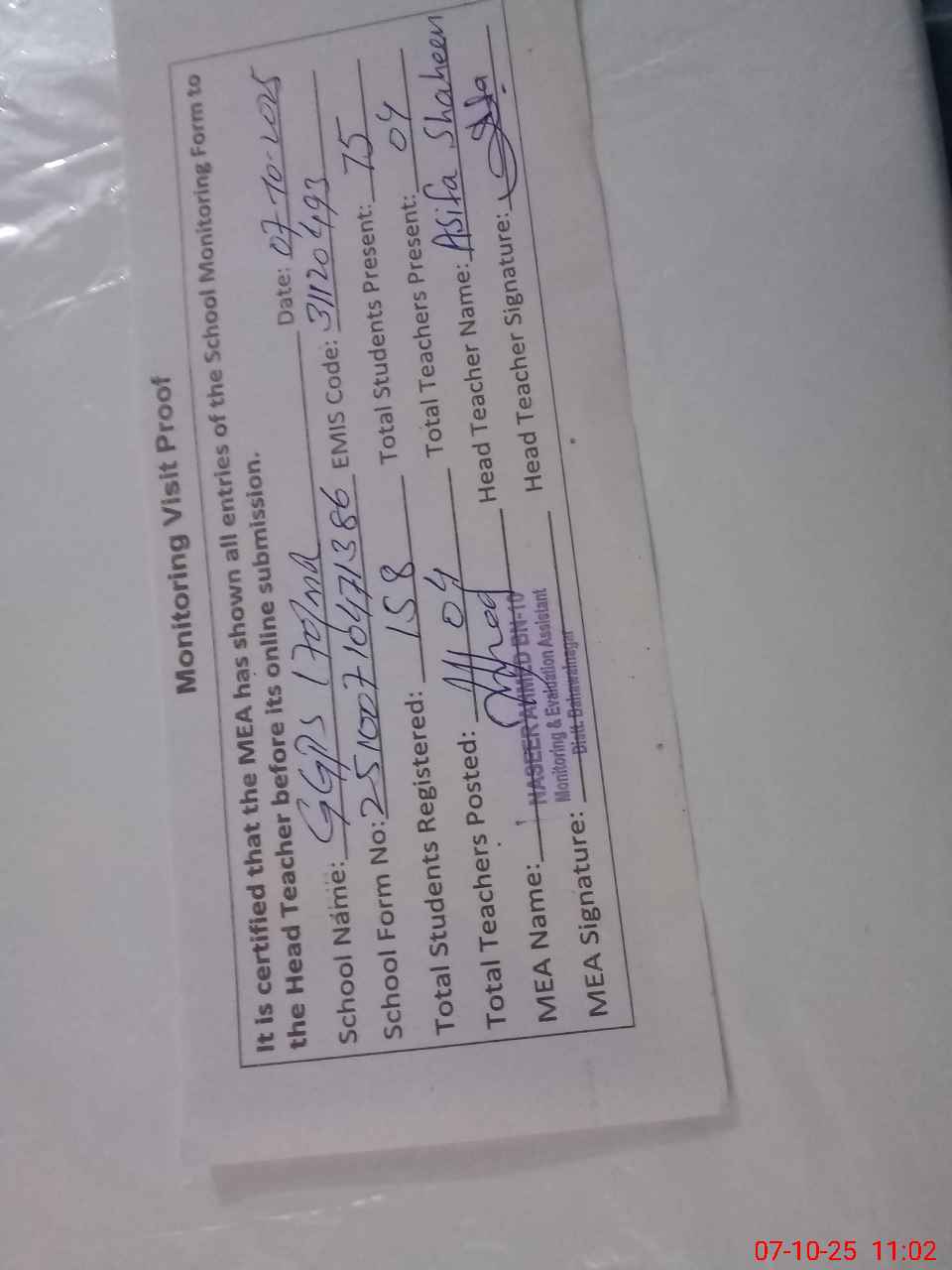 | Attendance Register | Head Teacher | MEA with School | Visit Proof |