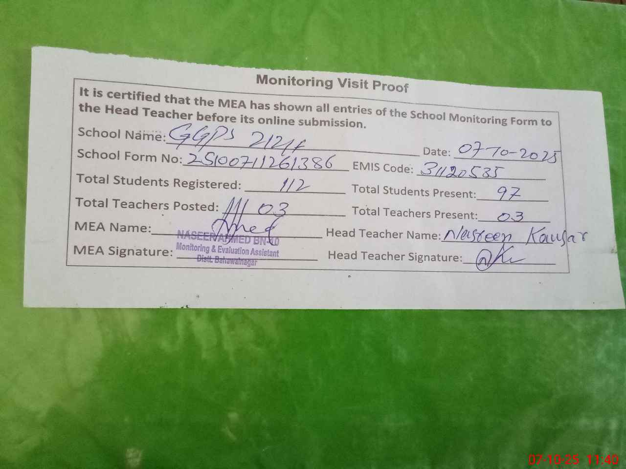 | EMIS Code: 31120535 | Name of School: GGPS CHAK NO. 212/F | |||