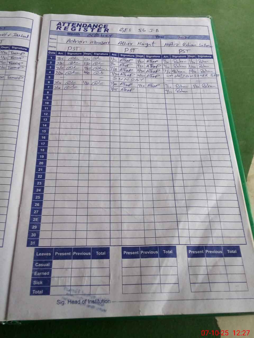 | CNIC | Full Name | Designation | R/C | Absence During Last Calender Month |