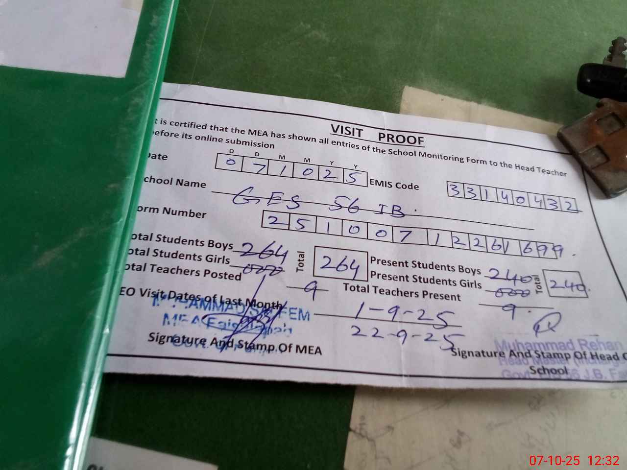 | Attendance Register | Head Teacher | MEA with School | Visit Proof |