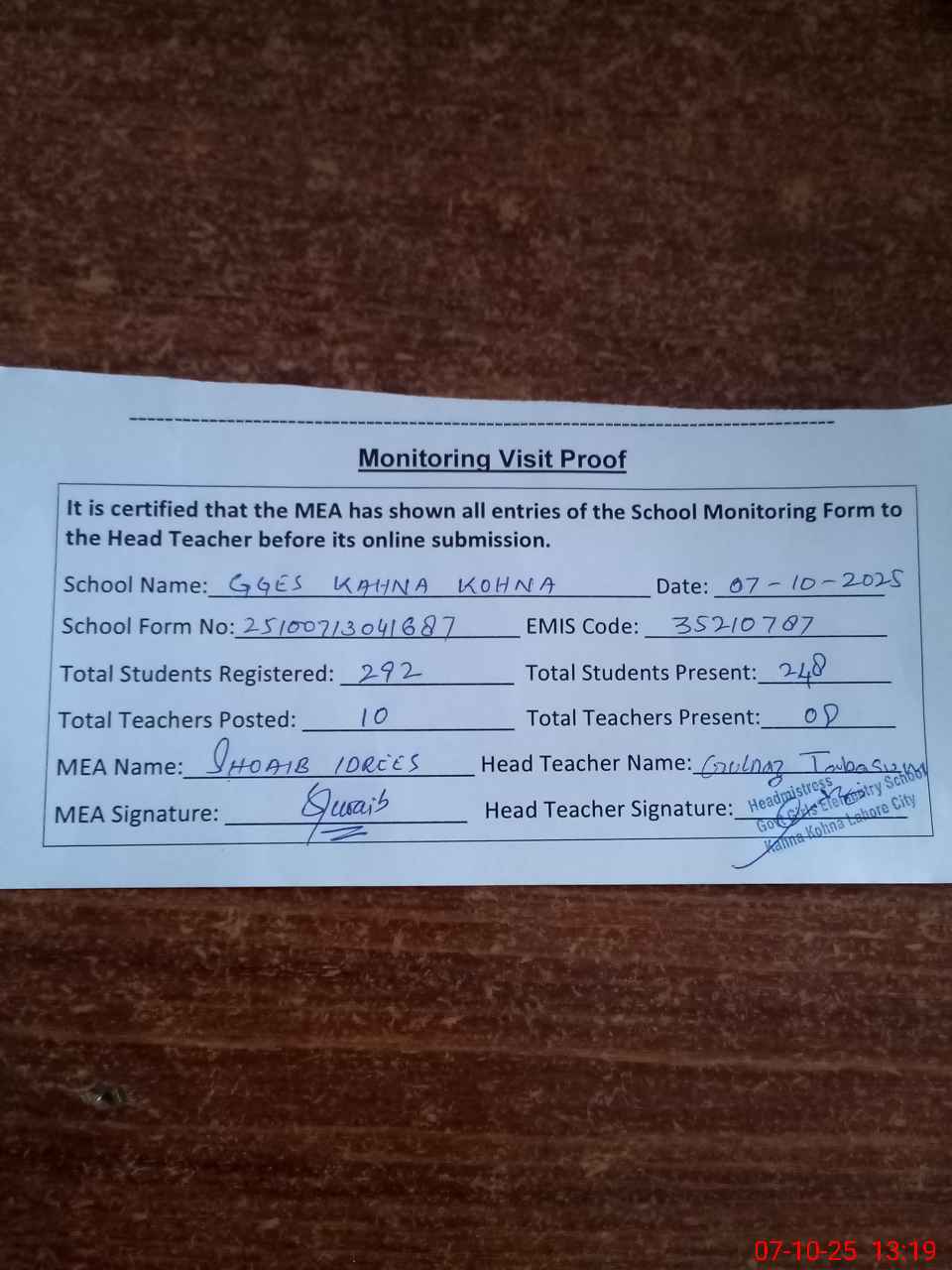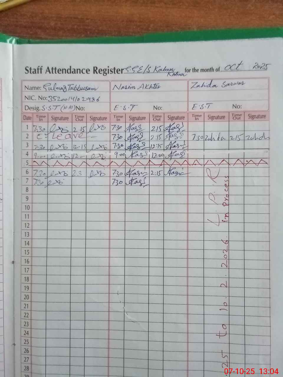 | Remarks (Use Separate Page if Required): 1 Mrs Zahida Sarwar EST shown on LPR but leave still pending from DEO EE so as per monitoring SOP marked her absent 2 FTF record not maintained properly for the month of Sep 2025 | |||||