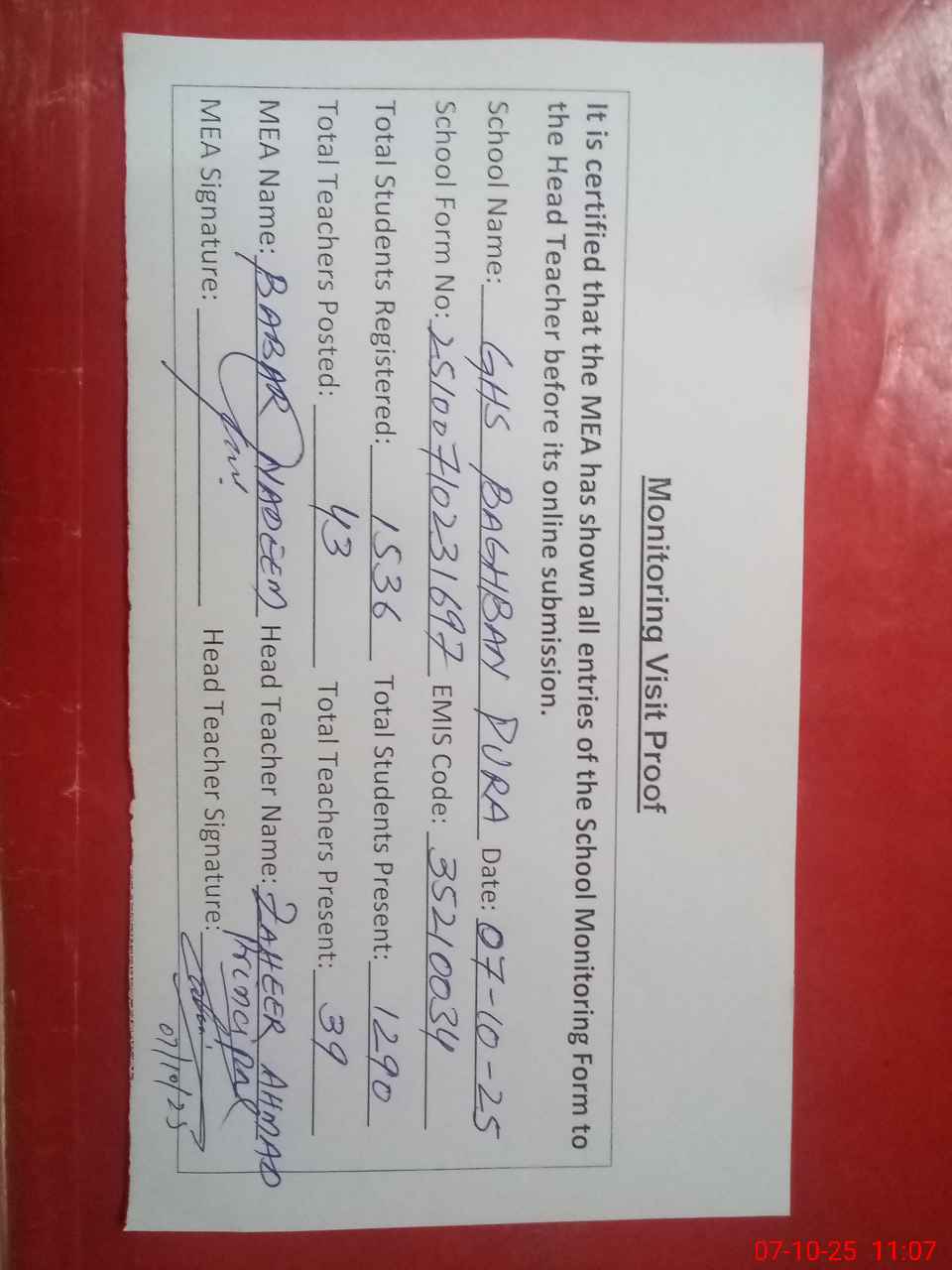 | Certified that this School was Inspected by the Undersigned MEA/DMO Today and the Information Stated Above is as Per Record. | |||||