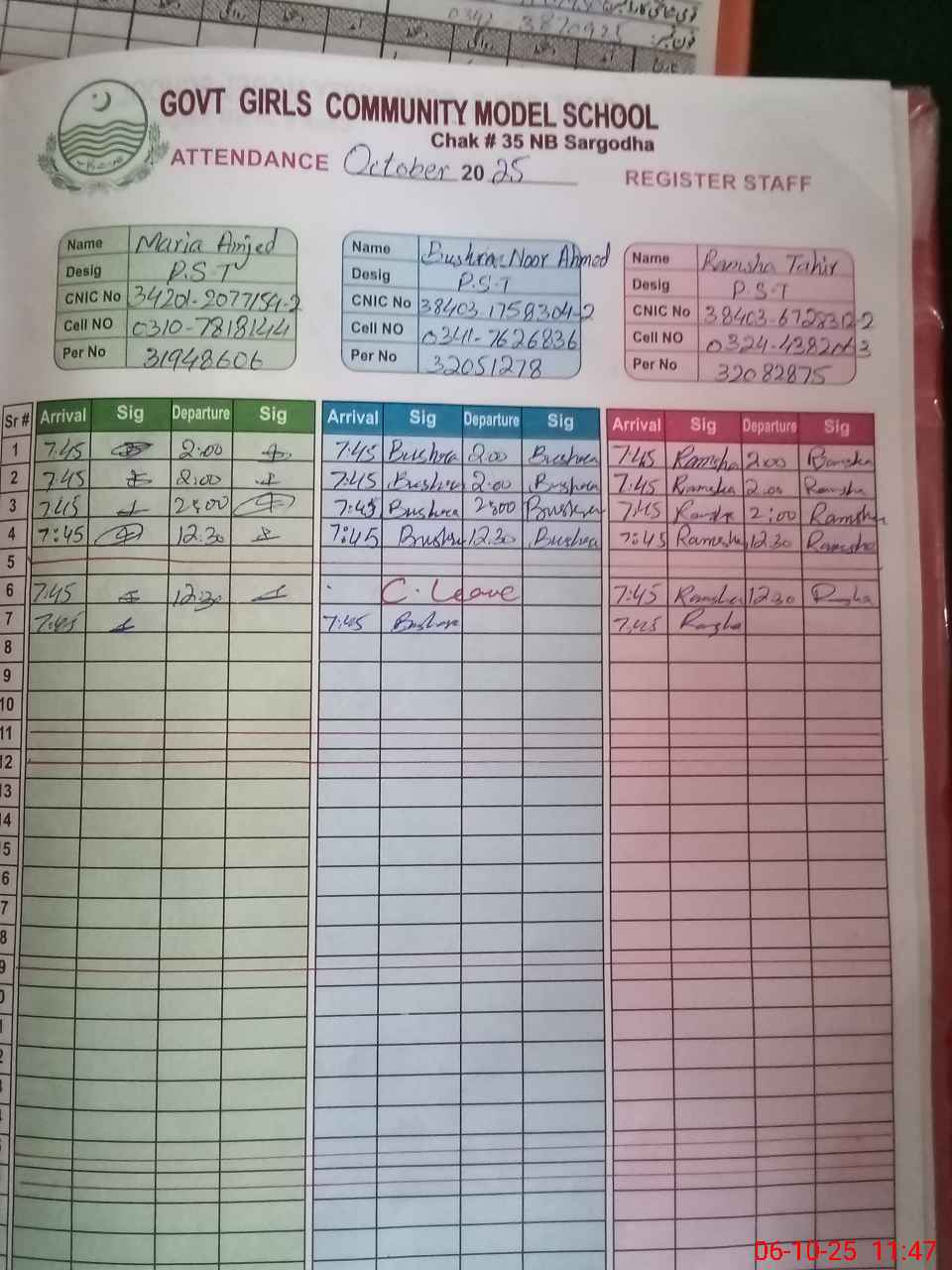 | CNIC | Full Name | Designation | R/C | Absence during last cal. month |