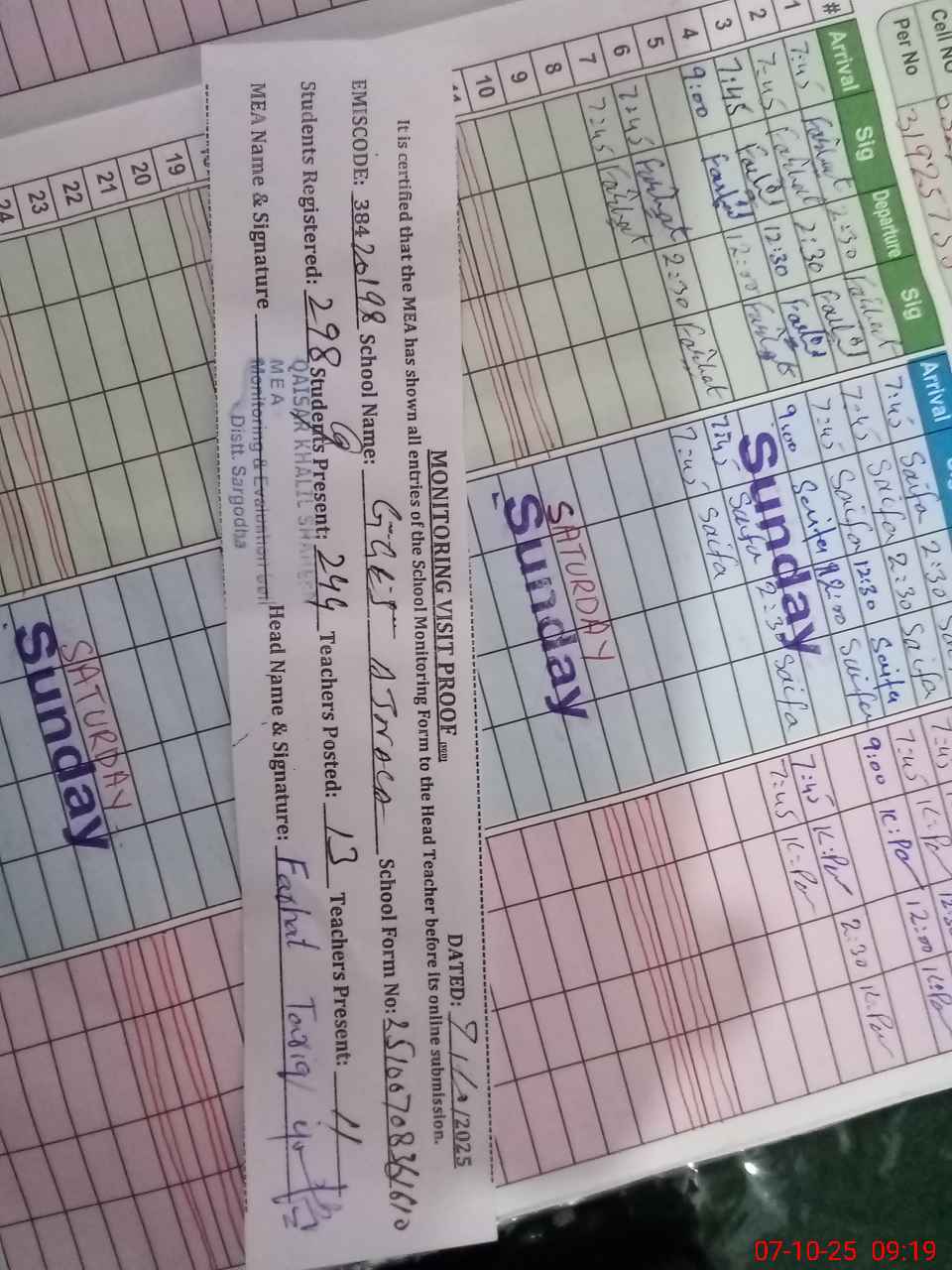 | Attendance Register | Head Teacher | MEA with School | Visit Proof |