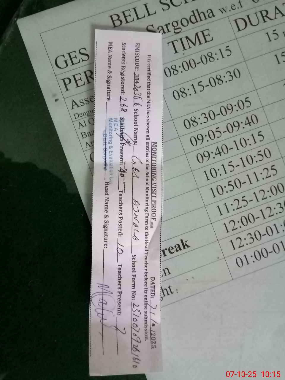 | Monitoring Date: 07-10-2025 | Start Time: 07-10-2025 09:19 AM | End Time: 07-10-2025 10:15 AM | Name of MEA: QA**** KH**** SH**** | |