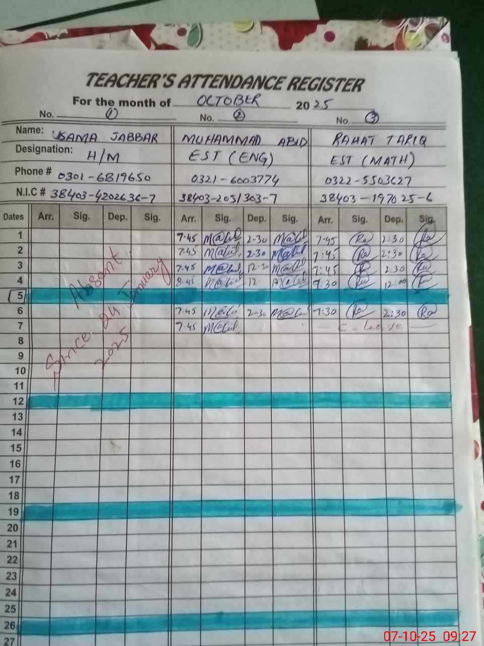 | CNIC | Full Name | Designation | R/C | Absence during last cal. month |