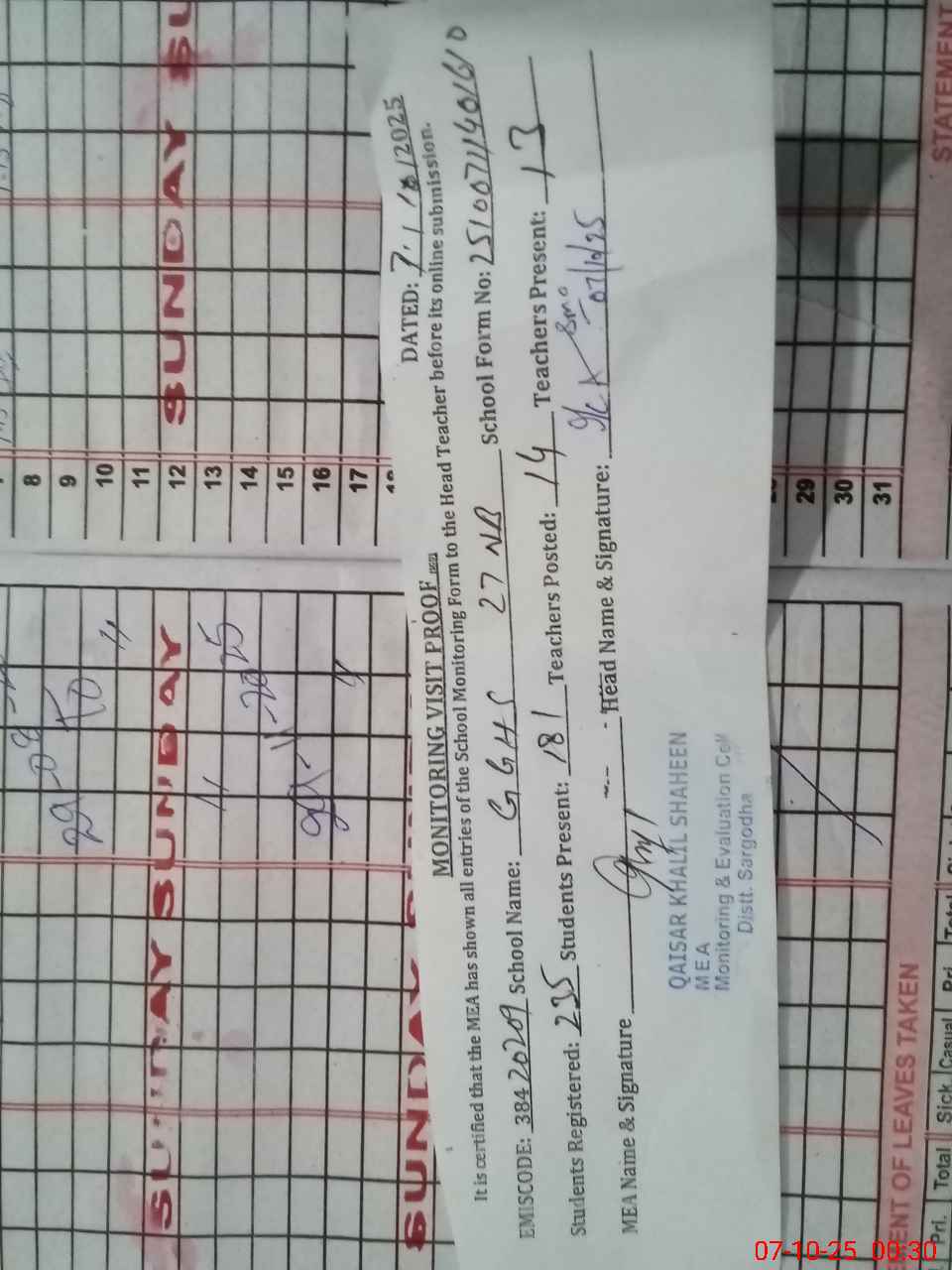 | Monitoring Date: 07-10-2025 | Start Time: 07-10-2025 11:40 AM | End Time: 07-10-2025 12:30 AM | Name of MEA: QA**** KH**** SH**** | |