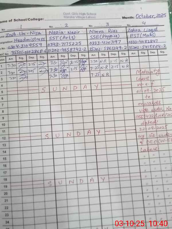 | Name: Za**** Designation: (School Headmaster's/Headmistress's) Head Mistress Phone/Cell Number: 03**** |