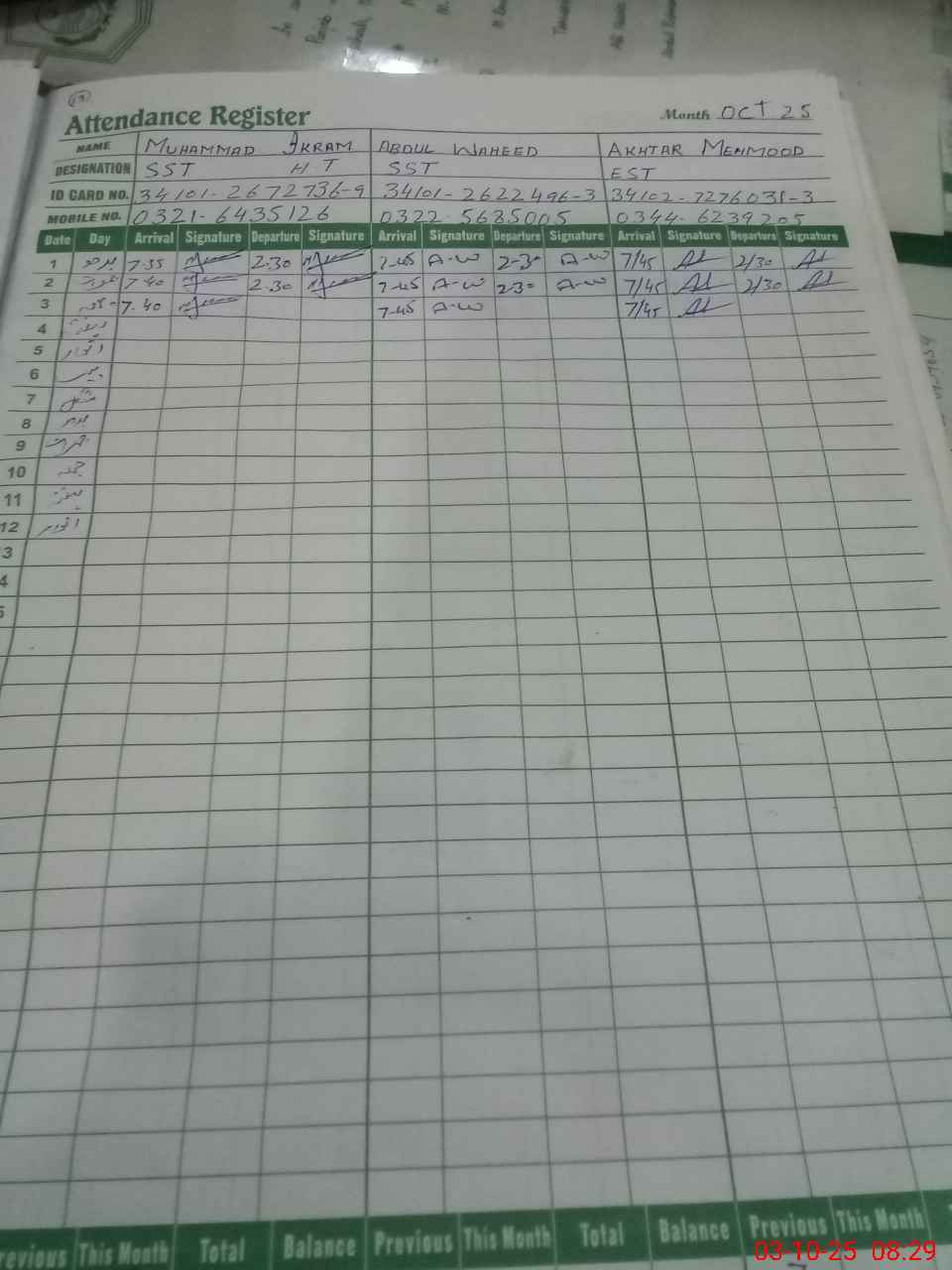| CNIC | Full Name | Designation | R/C | Absence during last cal. month |