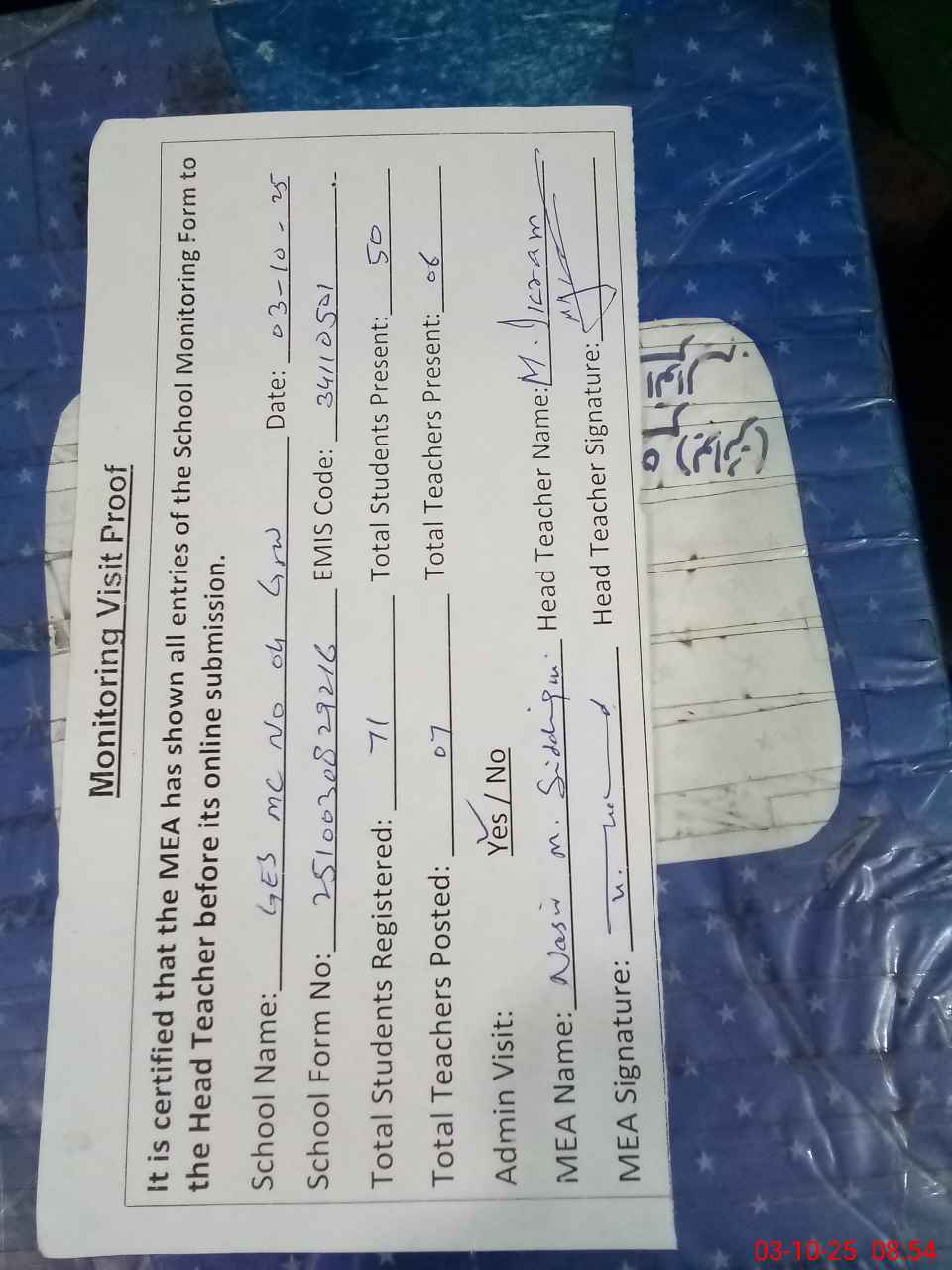 | Attendance Register | Head Teacher | MEA with School | Visit Proof |