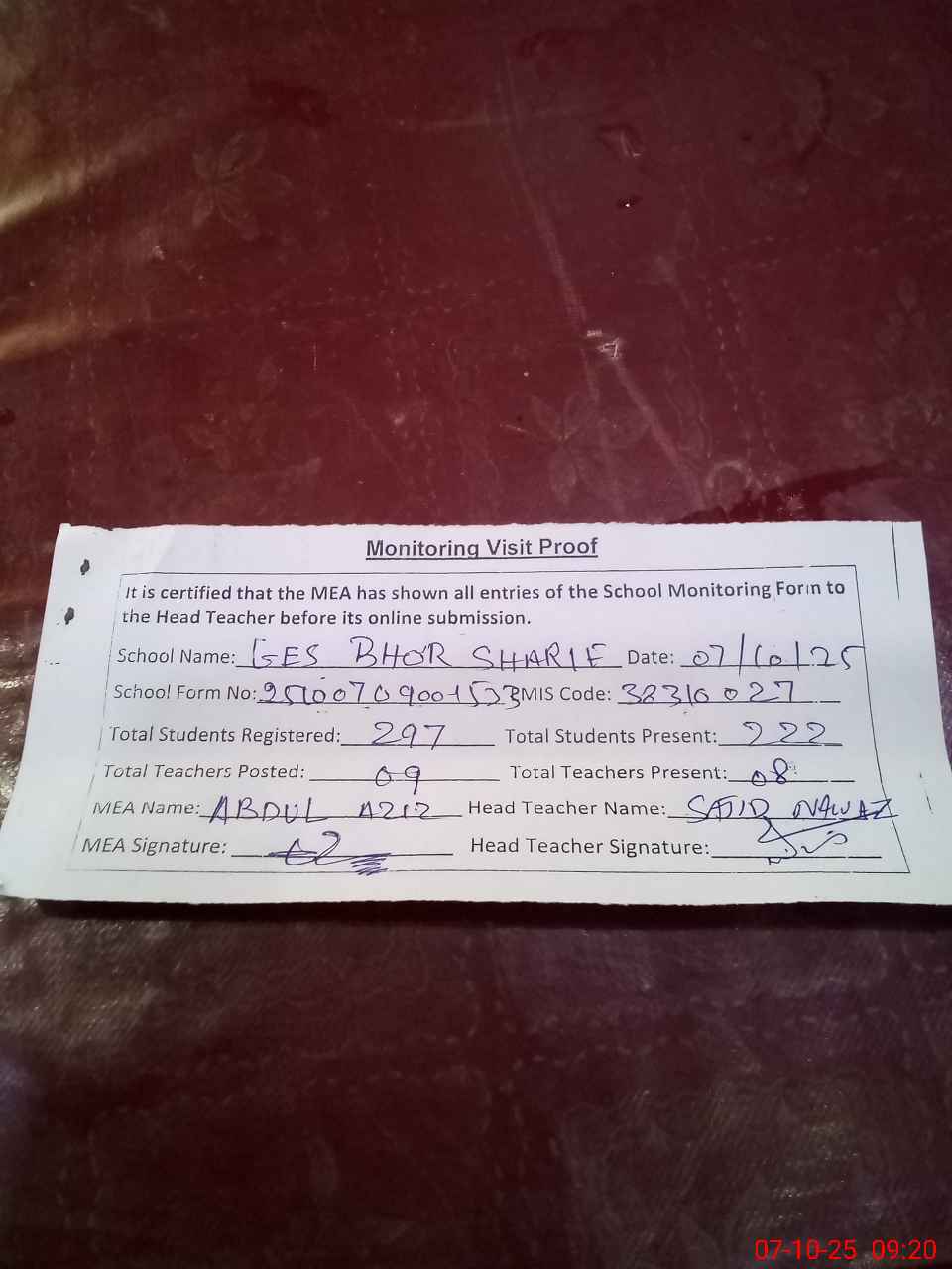 | EMIS Code: 38310027 | Name of School: GES BHORE SHARIF | |||