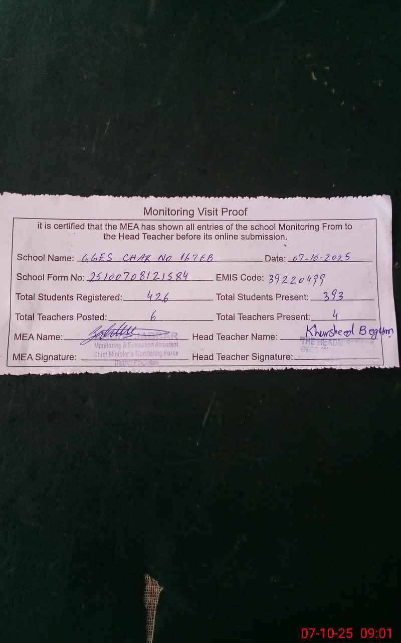| EMIS Code: 39220499 | Name of School: GGES CHAK NO.167 EB | |||