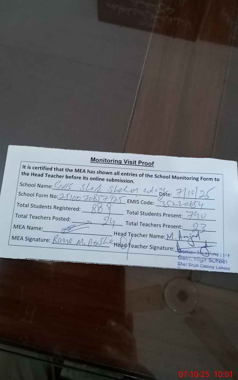 | EMIS Code: 35220654 | Name of School: GHS SHER SHAH COLONY RAIWIND ROAD | |||