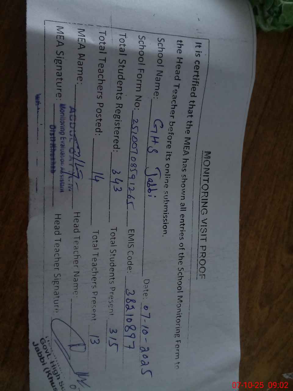 | Certified that this School was Inspected by the Undersigned MEA/DMO Today and the Information Stated Above is as Per Record. | |||||