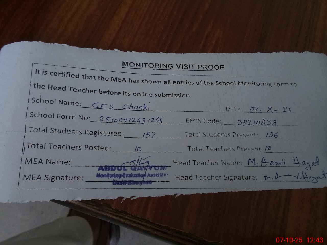 | Certified that this School was Inspected by the Undersigned MEA/DMO Today and the Information Stated Above is as Per Record. | |||||