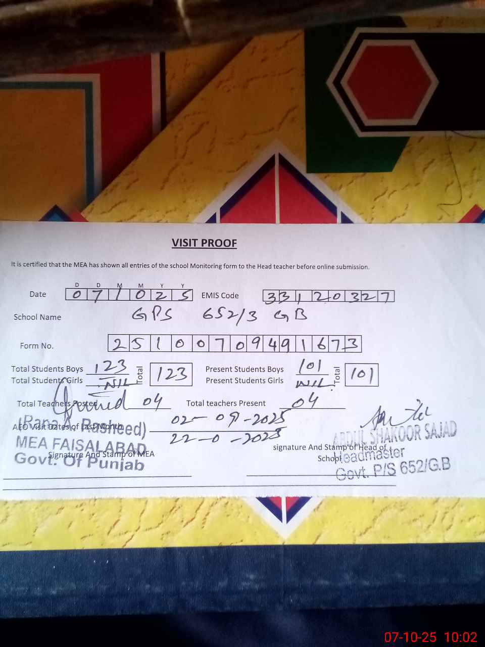 | Attendance Register | Head Teacher | MEA with School | Visit Proof |