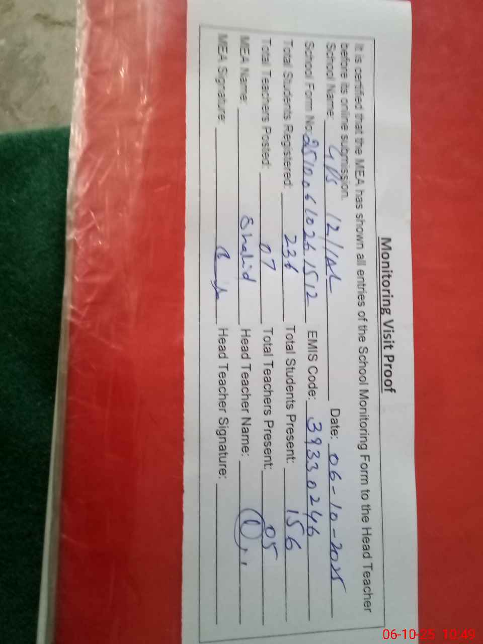 | Attendance Register | Head Teacher | MEA with School | Visit Proof |