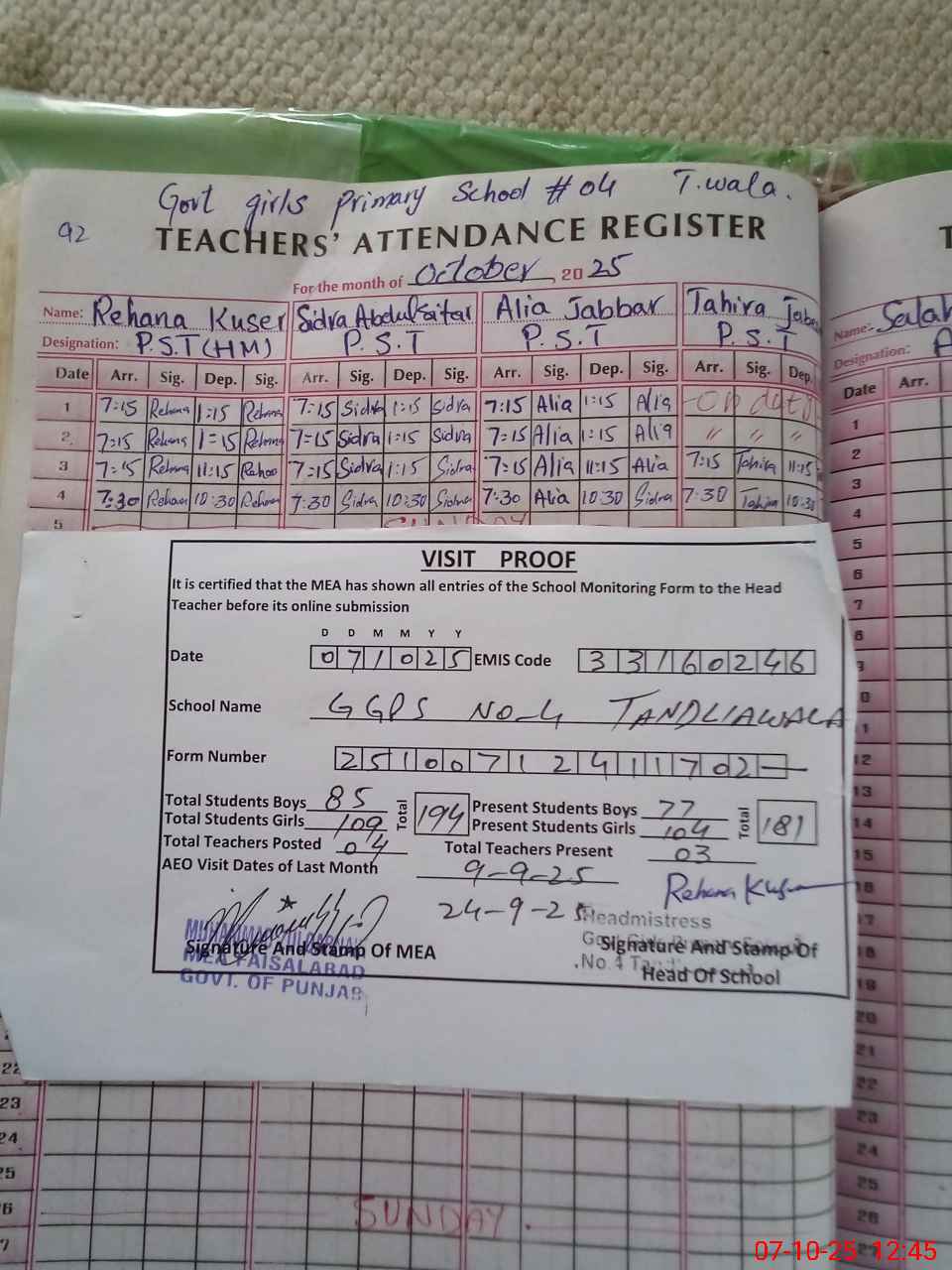 | EMIS Code: 33160246 | Name of School: GGPS 4 TANDLIANWALA | |||