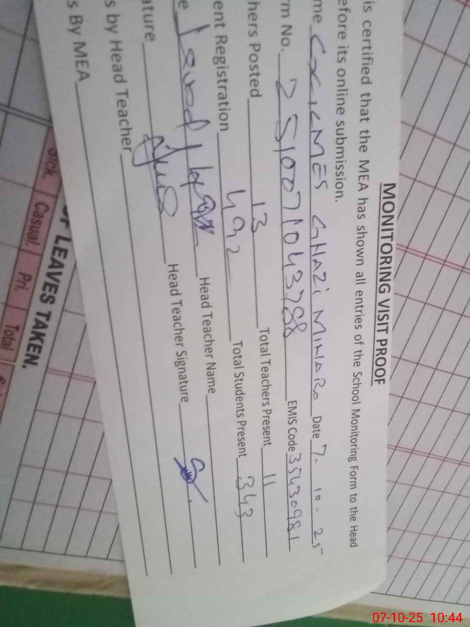 | Attendance Register | Head Teacher | MEA with School | Visit Proof |