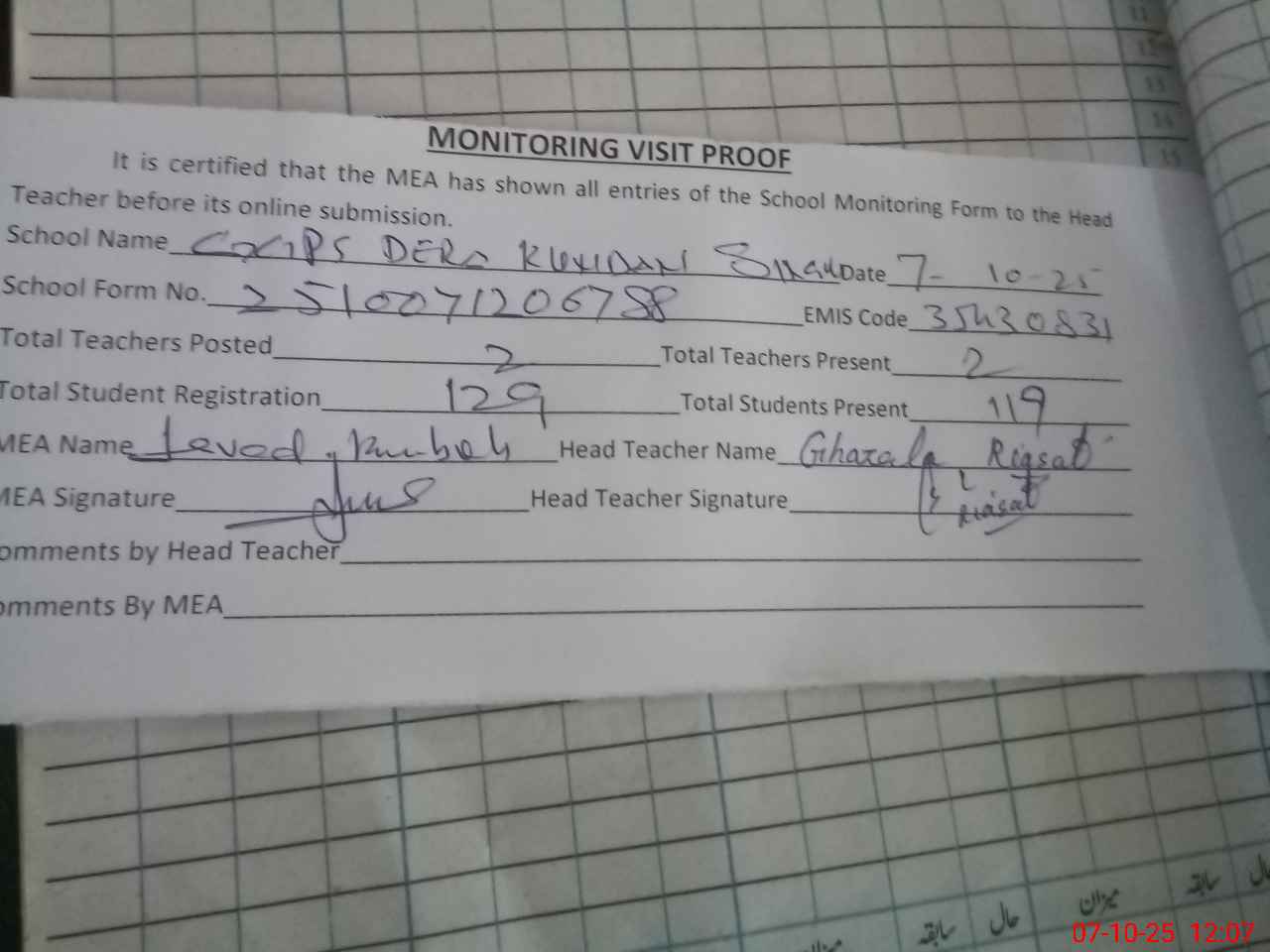 | Attendance Register | Head Teacher | MEA with School | Visit Proof |