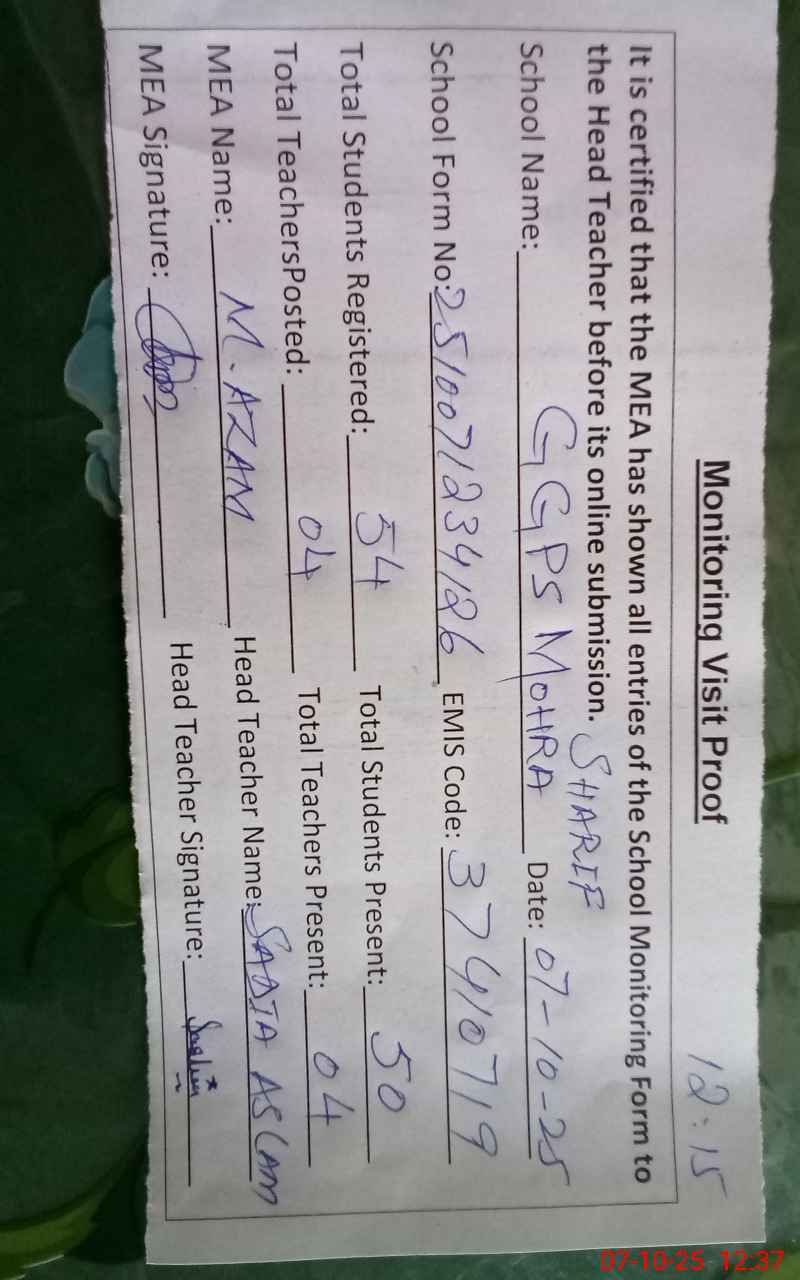 | EMIS Code: 37410719 | Name of School: GGPS MOHRA SHARIF | |||