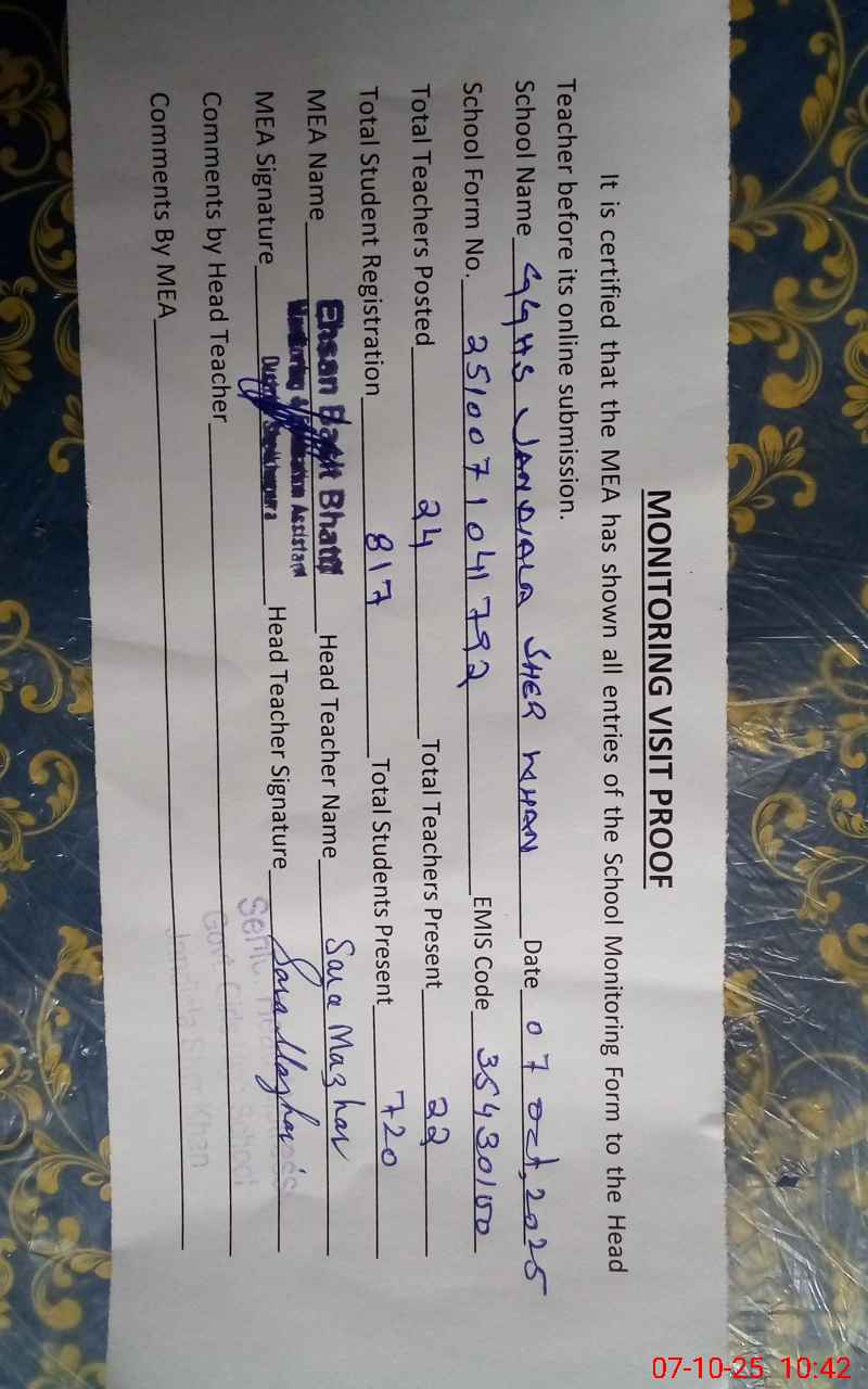 | Certified that this School was Inspected by the Undersigned MEA/DMO Today and the Information Stated Above is as Per Record. | |||||