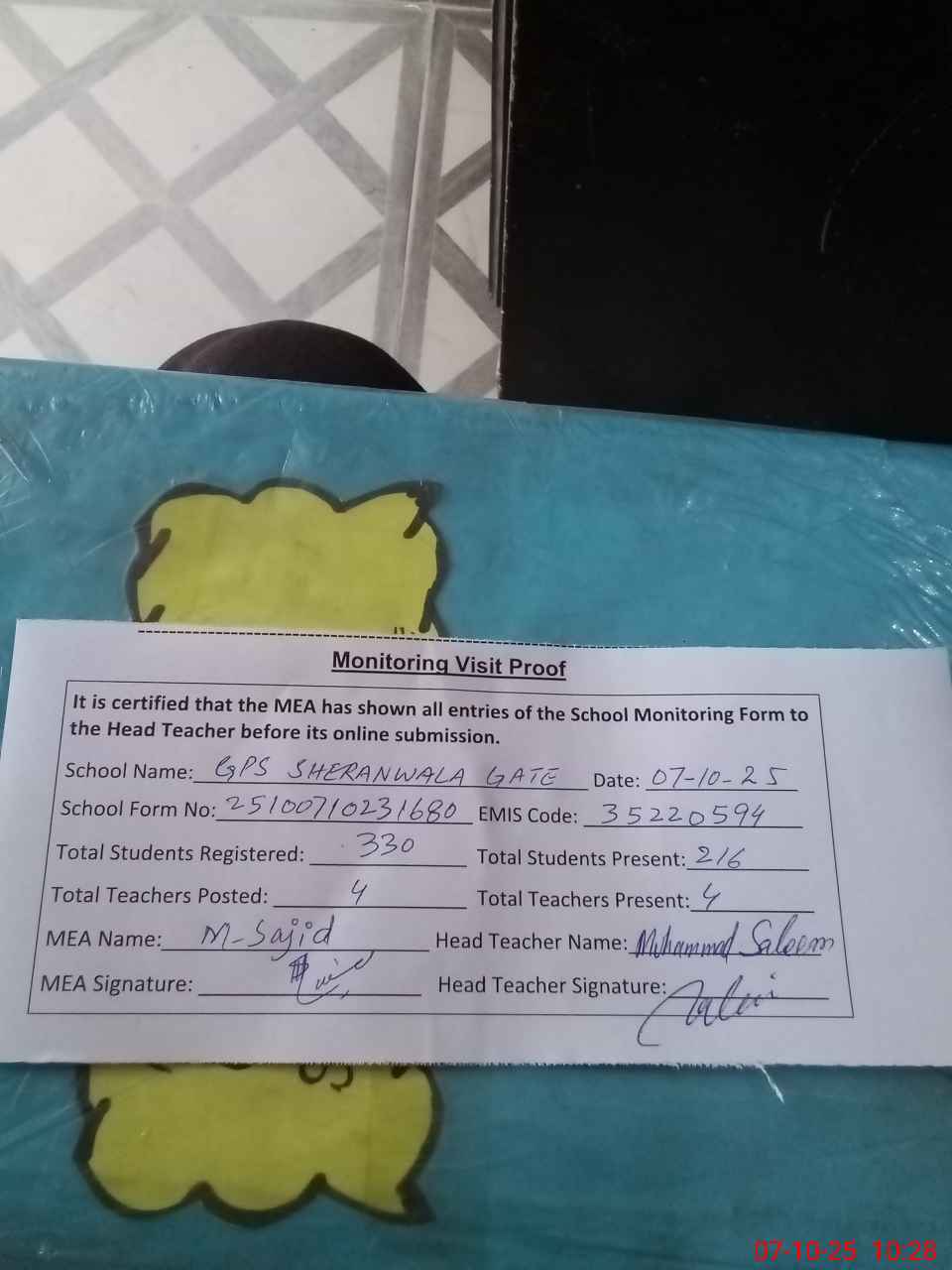 | EMIS Code: 35220594 | Name of School: GPS SHERANWALA GATE (EX-MCL) | |||