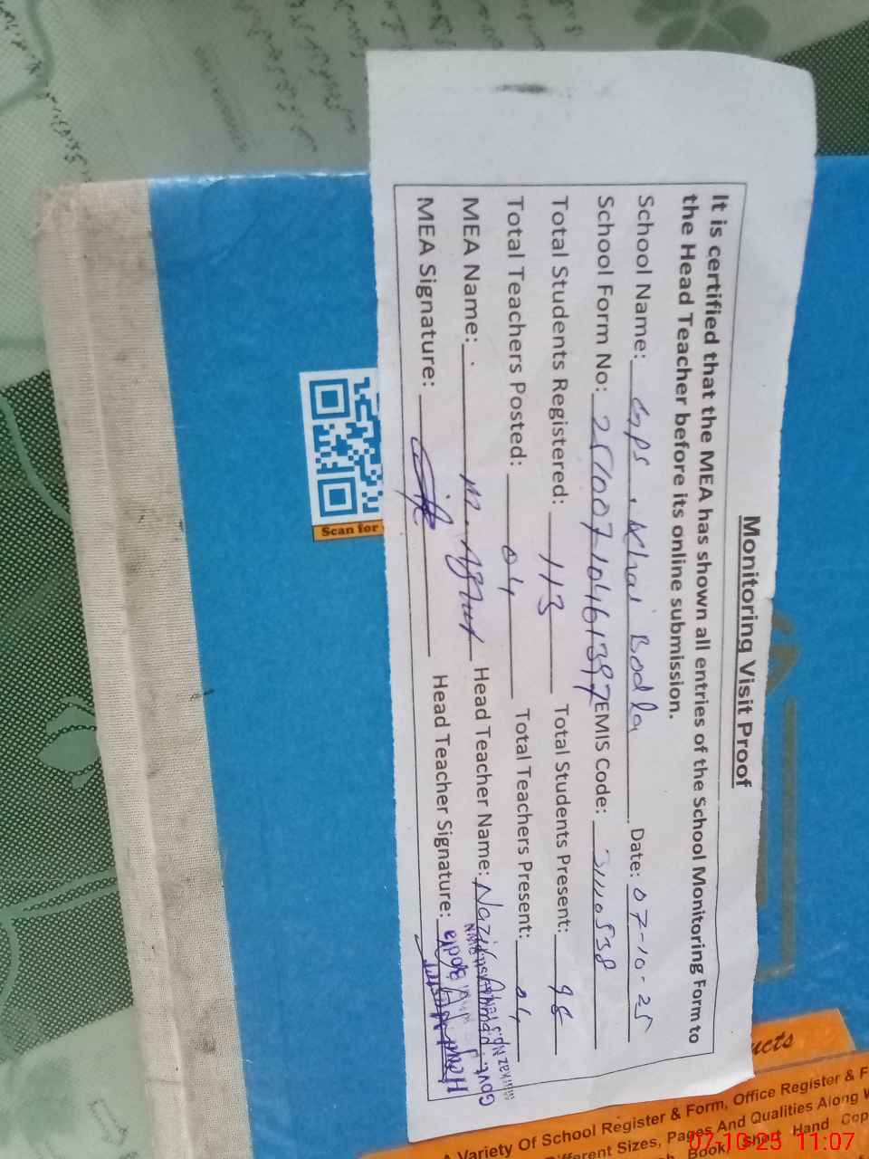 | Attendance Register | Head Teacher | MEA with School | Visit Proof |