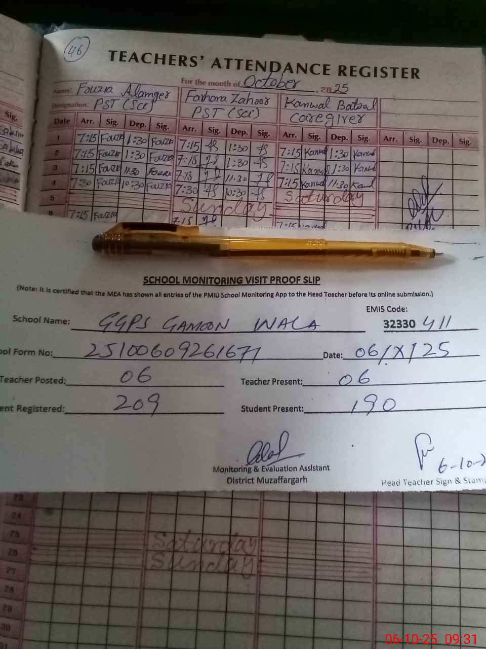 | Attendance Register | Head Teacher | MEA with School | Visit Proof |